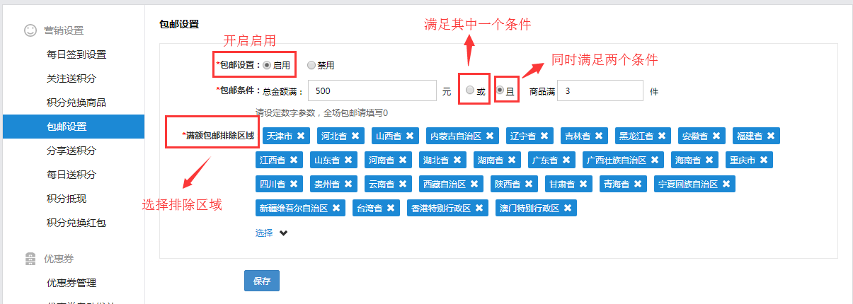 包邮设置:设置买家订单总额达到多少金额时可以进行包邮;全场满一定的件数包邮;或者全场同时满足金额与件数全场包邮;全场包邮填写数字0。选择满额包邮排除区域后点保存生效,如下图